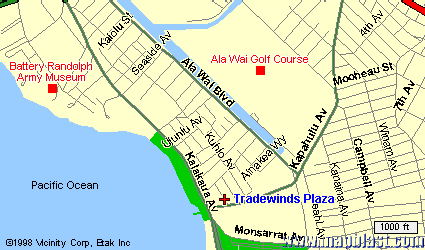 This map shows Waikiki with a red cross where Tradewinds Plaza